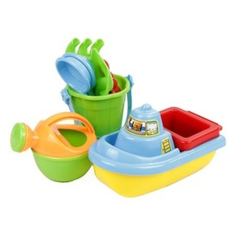 Homokozó 9 darabos készlet kishajóval Építs homokvárakat, vagy úsztasd a kishajót! A Homokozó 9 darabos készlet kishajóval műanyagból készült bástyás homokozó vödröt, kannát, szitát, lapátot, gereblyét és homokozó formát tartalmaz, egy színes műanyag