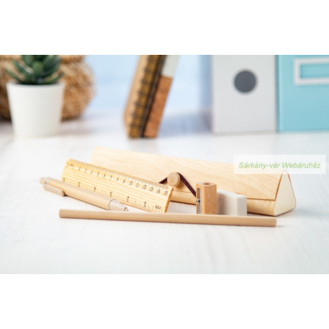 5 db-os fa írószerkészlet fa tolltartóban Méret: 200×37×44 mm Újrahasznosított papírból készült golyóstoll (kék tollbetéttel), Ceruza (HB, hegyezetlen), 15 cm-es vonalzó, hegyező és radír Rendelésre: 5-10 nap! A dekoráció nem képezi az ajánlat részét!