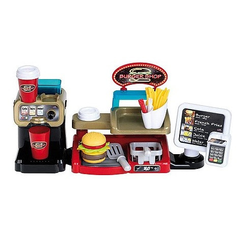 Klein Hamburger shop Üzemeltess hamburger shopot! A Klein Hamburger shop érintőképernyős kijelzővel, olajsütővel, vízáramlás funkciós italadagolóval és kártyás fizetési lehetőséggel ellátott gyorséttermi játék A Klein Hamburger shopban vedd fel a rend