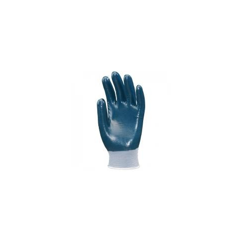 Nitril szerelőkesztyű, tenyerén és kézháton mártott, kék, 7- es méretű. Pamutból készült kesztyű, melyet kék nitrilbe mártottak. Biztos fogást nyújt a csúszásmentes markolat által.