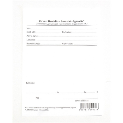 Orvosi beutaló-javaslat. A/6 méretű, álló.