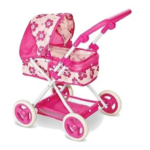 Összecsukható babakocsi - rózsaszín Játékbabád igazi luxusban érezheti magát a rózsaszín babakocsiban! Az összecsukható rózsaszín babakocsiban élmény lesz az utazás játékbabád számára A négykerekű összecsukható rózsaszín babakocsi erős fémvázzal kész