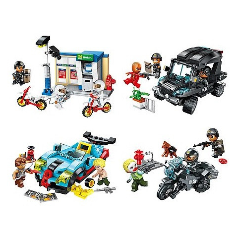 Qman Rablótámadások 4-es csomag Bankautomata rablás motorral, zavargások járőrkocsi támadás, szuper bevonatú autó, rablók elfogása motoros rendőrrel! A Qman Rablótámadások 4-es csomag mind a négy készletet tartalmazza! Sok munkája van a rendőrségnek a