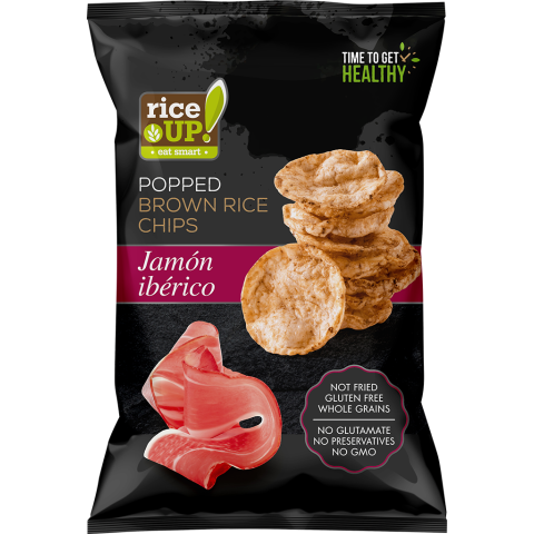 Teljes kiőrlésű barna rizs chips ibériai sonka ízesítéssel.