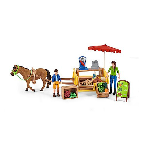 Schleich mobil piaci stand A Schleich mobil piaci standon Ben és az anyukája Laura bemutathatják és eladhatják a farmon termelt friss zöldségeket és gyümölcsöket A Schleich mobil piaci stand kiskocsiját Ben és az anyukája, Laura megpakolta friss zölds