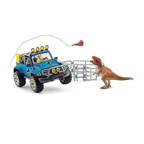 Schleich Terepjáró dinoval A Schleich Terepjáró dinoval és Luis kutatóval járja az Amazonas őserdejét, dinoszuruszra vadászik. Talál is egyet és egy nagy darab hússal csalja a dinot a ketrecbe A Schleich Terepjáró dinoval ketrecbe zárása után megeteti