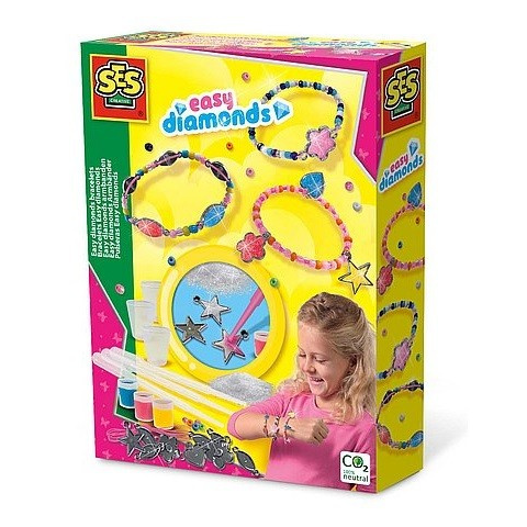 SES gyémánt karkötő készítő Készíts gyémánt karkötőket! A SES gyémánt karkötő készítő készlet medálokat, gyémántport, különböző színű oldatokat, színes üveggyöngyöket és rugalmas zsinórt tartalmaz A SES gyémánt karkötő készítő készletben található me