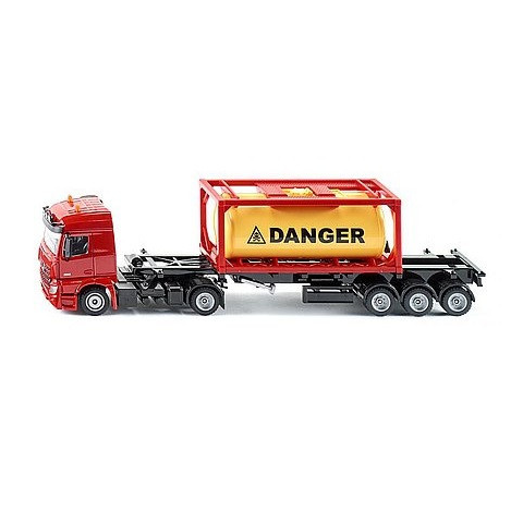 SIKU Mercedes-Benz utánfutóval és tartályos konténer rakománnyal 1:50 Szállítsd a veszélyes anyag tartályt Mercedes-Benz vontatóval! A SIKU Mercedes-Benz utánfutóval és tartályos konténer rakománnyal vontató teherautó egy piros vontató veszélyes anyag