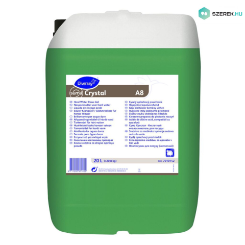 SUMACrystal A8 Folyékony savas öblítőszer Termékleírás A Suma Crystal A8 sűrített gyenge habzású öblítőszer mosogatógépekhez, savas kémhatású, folyékony gépi öblítőszer koncentrátum. Legfontosabb tulajdonságok A Suma Crystal A8 koncentrált savas öblítő a