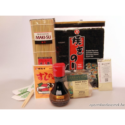 A szett tartalmazza a következőket: 10 db Yaki Nori algalapot, 1 db Profi Maki Sushi tekerő szőnyeget, 250 g elsőosztályú Sushi Rizst (Shinode), elegendő 4 főre való Sushi elkészítéséhez, 25 g Wasabi por, mely pillanatok alatt zöld erős Wasabi pasztává gyúrható, 1 tasak Sushi rizs ízesítő ecetport, a megfelelő állagú rizs elkészítéséhez, 1 db Prémium minőségű Szójaszósz (150 ml) praktikus asztali kiöntőüvegben, 1 zacskó Sushi Gyömbért, Daruma Sushi Gari 100 g, valamint 4 pár evőpálcikát, hogy az élmény eredeti legyen.
