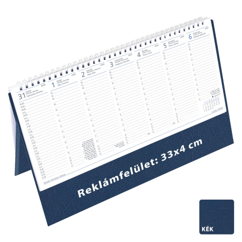 Naptár, asztali, álló, TOPTIMER, kék -méret: 325x155 mm -lap típusa 70 g, fehér ofszet -időbeosztás: 6-22. 00 h (félórás, 8-18. 00 h) -hátlap anyaga műbőr bevonatos tábla -magyar naptárháló -magyar ünnepek, névnapok -nemzetközi ünnepek, holdfázis