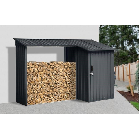 Anyag/szín: fém, antracit Méretek (H/Sz/M): 105 x 270 x 158 cm Fatároló alapterülete: 53 x 162 cm Fészer alapterülete: 102 x 96 cm Űrtartalom: 1,3 + 1,4 m³ Ajtó: egyszárnyas Korrózióvédelem: tűzihorganyzás Felszínbevonat: égetett porfestés Acél panelek va