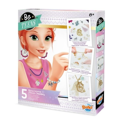 Készíts 5 divatos unikornisos ékszert! Fűzd, készítsd elő és szereld össze a gyöngyöket és a medálokat! 2 nyakláncot, 1 pár fülbevalót és 2 karkötőt tudsz megalkotni a készlet segítségével. Tartalma: színes medálok, arany medál, pompom, láncok, kapcsok és
