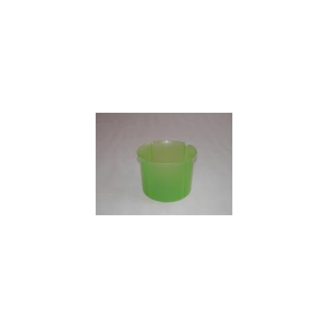 Átlátszó zöld színű, műanyag, szirom formájú virágtartó kaspó. Az átmérője 130 mm.