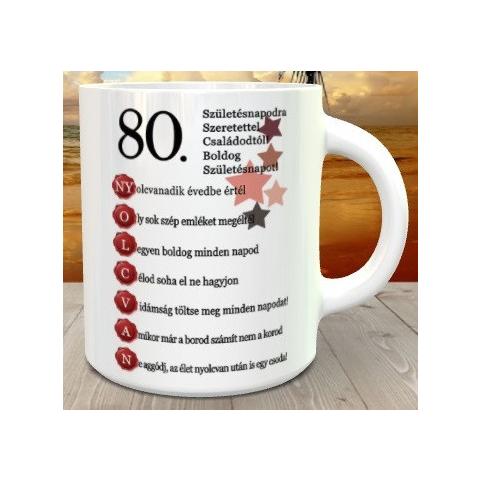 80. szülinapi bögre, ajándék születésnapra. Különleges születésnapot egyedi stílusban! Ez a bögre tökéletes ajándékötlet azoknak, aki valami egyedivel szeretnének kedveskedni. A bögre különlegessége, hogy a 80-as szám mellé egyedi feliratot és kérhetsz, í