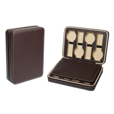 Igényes utazótok 8 karórához, jó minőségű mesterséges bőrből sötétbarna színben vastag fehér varrással. Praktikus méret, zippzáros. Masszív és bélelt kialakításának köszönhetően biztonságosan szállíthatja óráit! A belső kialakítás: 140 mm hosszan, akár