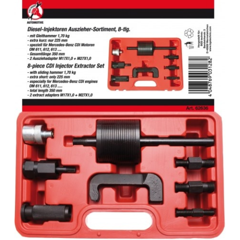 Extra rövid kialakítás.Bosch injektorokhoz a következő motoroknál:BMW, Mercedes-Benz CDI motorok: OM 611, 612, 613A készlet tartalma:CsúszókalapácsKiszedő adapter: M17 x 1.0 külső menetKiszedő adapter: M27 x 1.0 belső menetTovábbi tartozékokTechnikai