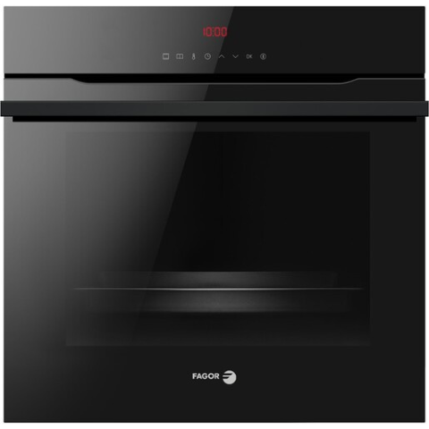 Fagor elektromos multifunkciós sütő 59,5 cm szélességgel, 59,5 cm magassággal és 57,5 cm mélységgel. Fekete színben, a készülék teleszkópos hosszabbítókkal van felszerelve, energiaosztálya A+.