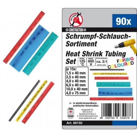 A készlet tartalma: - 15 db zsugorcső, 1.5 x 40 mm - 15 db zsugorcső, 2.5 x 40 mm - 15 db zsugorcső, 4.0 x 40 mm - 15 db zsugorcső, 6.0 x 40 mm - 15 db zsugorcső, 10.0 x 40 mm - 15 db zsugorcső, 4.0 x 75 mm