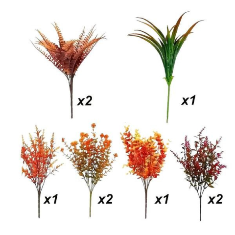 9 darabos Őszi Művirág Csokor Szett PC246341 Dobd fel otthonodat vagy kertedet ezzel a 9 darabos UV-álló művirág szettel, amely élethű őszi színekben pompázik. A narancssárga, sárga és vörös árnyalatokban játszó levelek és ágak tökéletesen visszaadják az őszi természet hangulatát, így kiválóan alkalmas ablakkeretek, erkélyek, kertek vagy kandallópárkány díszítésére.Jellemzők:Kiszerelés: 9 db művirág csokorMéret: kb. 35–43 cm szálankéntAnyag: tart