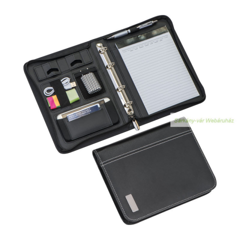 Kiváló minőségű bőrrostokból készült A5 mappa, cipzárral, különböző zsebekkel, tolltartó pánttal, okostelefon zsebbel és -tartóval, gyűrűs mechanizmussal és bélelt részekkel, továbbá kisméretű nyomtatott naptár részes, vonalas jegyzettömbbel. Méret: 19,8