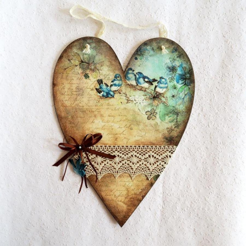 Nagy szív alakú fatáblára dekupázs technikával készült kép, amit szalag és csipke tesz különlegessé.