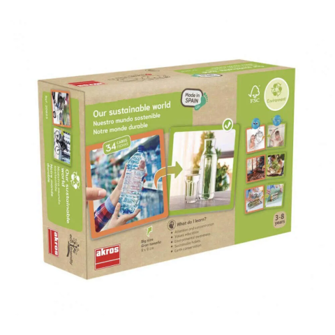 A mi fenntartható világunk játék fejleszti a megfigyelőképességet, gazdagítja a szókincset, valamint segít a környezet iránt érzett felelősségtudat kialakításában.A játékban a kártyák párokban vannak. Minden narancssárga kártyá