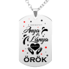 Választható rozsdamentes alumínium medál, vagy nemesacél tükörpolírozott kivitel is, arany vagy ezüst színekben. Az alapár az alumínium medálra vonatkozik lánccal vagy kulcstartóval együtt (válassz a listából, vagy rendeléskor írd be