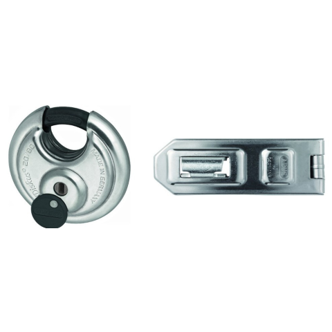 Abus Diskus 20/80 lakat+Abus 140/120 lakatpánt A legmagasabb biztonsági követelményeknek megfelelő, időjárásálló lakat, valamint a hozzátartozó edzett korrózió álló acélból készült lakatpánt, megerősített védelemmel a csuklónál. Zárt állapotban a rögz