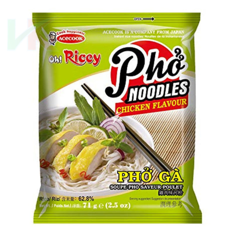 Acecook Oh! instant rizstészta csírke ízú pho ga 70g A phở gà vietnamiul csirkés pho jelent. Ez egy változata a híres vietnami pho-nak, ahol a hagyományos marhahús helyett csirkét használnak a leves alapanyagaként. Összetevők: Rizstészta (70,9%): riz