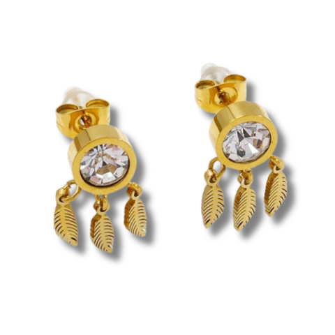 Stílusos acél álomfogó fülbevaló strasszkövekkel és aranyozott tollakkal. Különleges és egyedi kiegészítő minden alkalomra