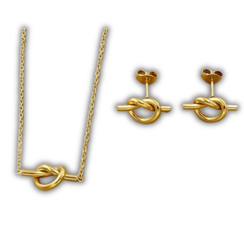Aranyozott acél csomós szett állítható nyaklánccal és fülbevalóval. Különleges, modern formatervezésű ékszer szimbolikus csomó motívummal