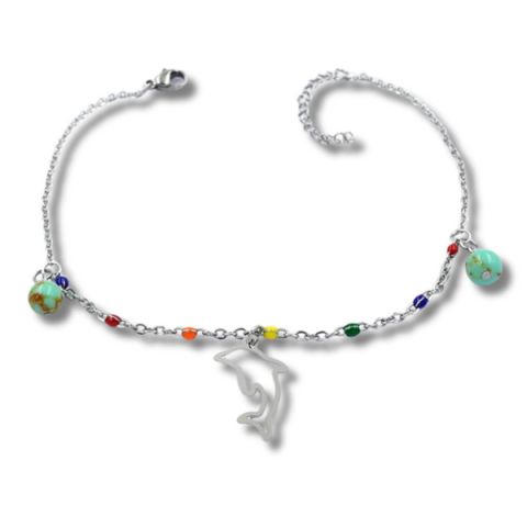 Ezüst színű bokalánc delfines medállal és színes gyöngyökkel. Állítható hosszúság, tökéletes kiegészítő tengerparti és nyári viselethez