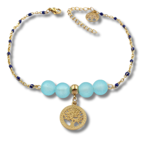 Arany színű acél életfás bokalánc kék gyöngyökkel, állítható hosszúsággal. Tartós rozsdamentes acél, különleges természet ihlette ékszer