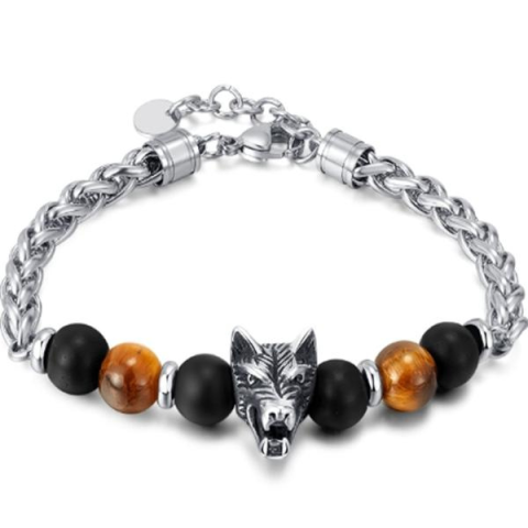 Masszív, fonott acél karkötő farkasfejes medállal és díszgolyókkal. Extravagáns férfi kiegészítő, ami erőt és egyediséget sugároz minden megjelenéshez