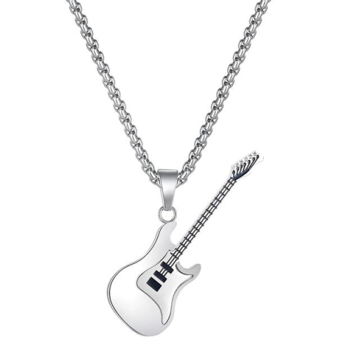 Rozsdamentes acél gitáros nyaklánc fekete díszítéssel, részletgazdag kidolgozással. Látványos medál, amely a zene és a gitár iránti szenvedélyt fejezi ki