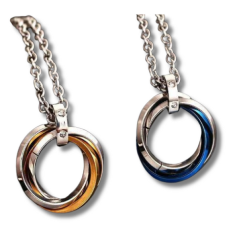 Egyedi kék–ezüst acél háromgyűrűs nyaklánc, erőteljes és stílusos megjelenéssel. Tartós, rozsdamentes acélból készült férfi kiegészítő minden alkalomra