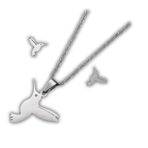 Elegáns kolibris acél szett: nyaklánc és fülbevaló finom kidolgozással. Tökéletes ajándék természetkedvelőknek és ékszerrajongóknak