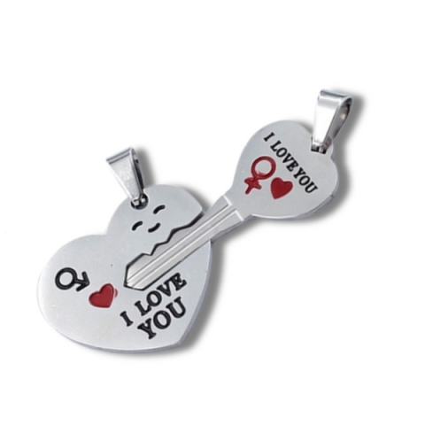 Két összeilleszthető acél medál piros szívvel és „I Love You” felirattal. Tökéletes páros ékszer szerelmeseknek, romantikus ajándék minden alkalomra