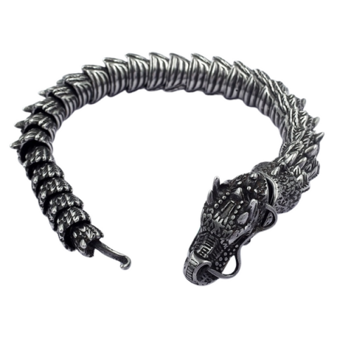 Impozáns acél karkötő sárkány motívummal, 21 cm hosszúsággal és masszív kialakítással. Karakteres férfi kiegészítő az erő és stílus kedvelőinek
