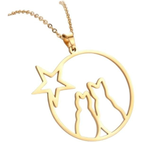 Arany színű acél nyaklánc két cicával és csillag motívummal. Tartós, elegáns és romantikus ékszer, tökéletes ajándék macskakedvelőknek