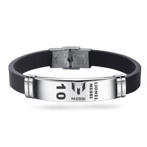 Egyedi Lionel Messi karkötő rozsdamentes acél és szilikon kombinációjával. Sportos, állítható méretű dizájn, tökéletes ajándék futballrajongóknak