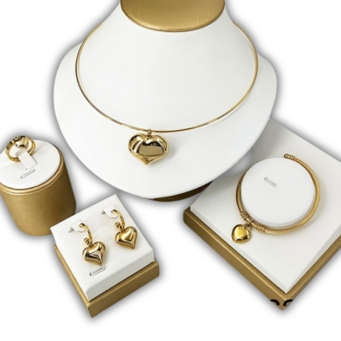Aranyozott acél ékszerszett szív medálokkal. Elegáns nyaklánc, karkötő, gyűrű és fülbevaló egy készletben. Tökéletes ajándék és stílusos viselet