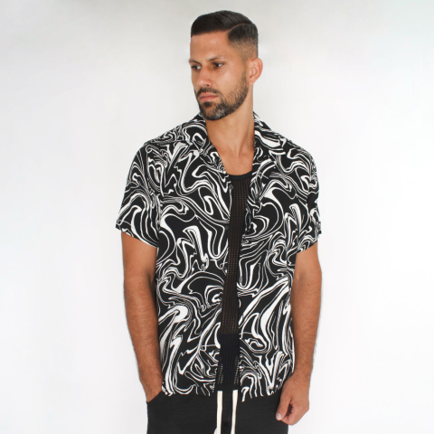 Slim fit szabású, fekete rövidujjú ing fehér mintával, vékony lezser anyagból, gallérral és egyenes alsó szegéllyel Modell: 185 cm/ 85 kg/ L-es méret