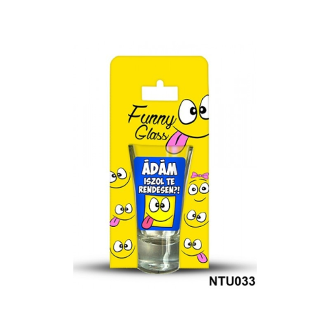 Névvel és vicces felirattal díszített pálinkás pohár. Anyaga: üveg Űrtartalom: 5 cl Befoglaló mérete: 7 x 5 x 15 cm