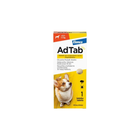 Az AdTab egy kicsi, hús ízű rágótabletta kutyák részére, ami gyorsan hat bolhák és kullancsok ellen. Biztonságos, hatékony és már két órán belül elkezd hatni. A készítmény alkalmazható 8 hetes vagy annál idősebb és 1,3 kg vagy annál nagyobb testtömegű kutyák kezelésére, biztonságosságát ellenőriztük, és a h
