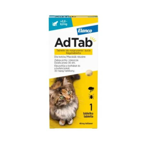 Az AdTab™ egy ízletes és könnyen beadható rágótabletta macskák részére, ami egy hónapos védelmet nyújt macskádnak bolhák és kullancsok ellen és segít otthonodat is megvédeni.