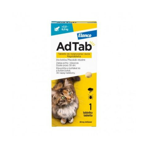 ADTAB rágótabletta macskáknak 48 mg egy ízesített lotilaner tabletta, amely 24 óra alatt elpusztítja a bolhákat és 48 óra alatt a kullancsokat. Egyetlen tabletta 30 napig védi a 2-8 kg-os cicákat, 8 hetes kortól biztonságosan alkalmazható. Az ADTAB 4