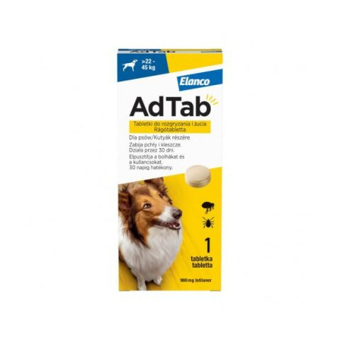 AdTab 900 mg rágótabletta azonnal elpusztítja a bolhákat és kullancsokat a 22-45 kg-os kutyákon, majd 30 napig távol tartja őket. Ízesített falatként egyszerűen beadható, nincs bundafolt, 8 hetes kortól biztonságos. Az AdTab 900 mg lotilaner rágótabl