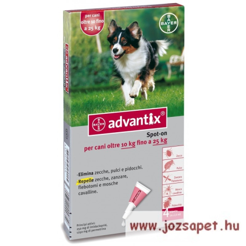 Advantix Spot-On 10-25kg közötti kutya számára 1 pipetta, 2,5 ml Ötszörös védelem: Az Advantix® spot on kifejezetten kutyáknak kifejlesztett külső élősködők elleni készítmény. Hatékony védelmet nyújt kullancsok, bolhák, legyek, igazi- és lepkeszúnyogok v